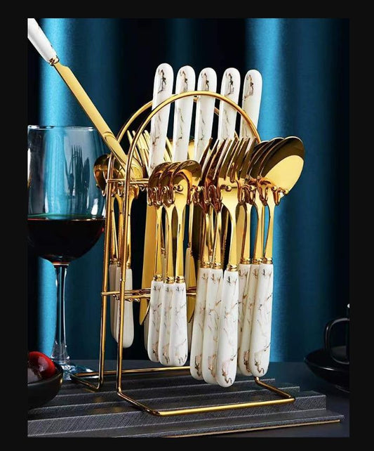 ZS - 24pcs Gold Dinnerware Flatware Set with Marbled Ceramic Handle & Holder