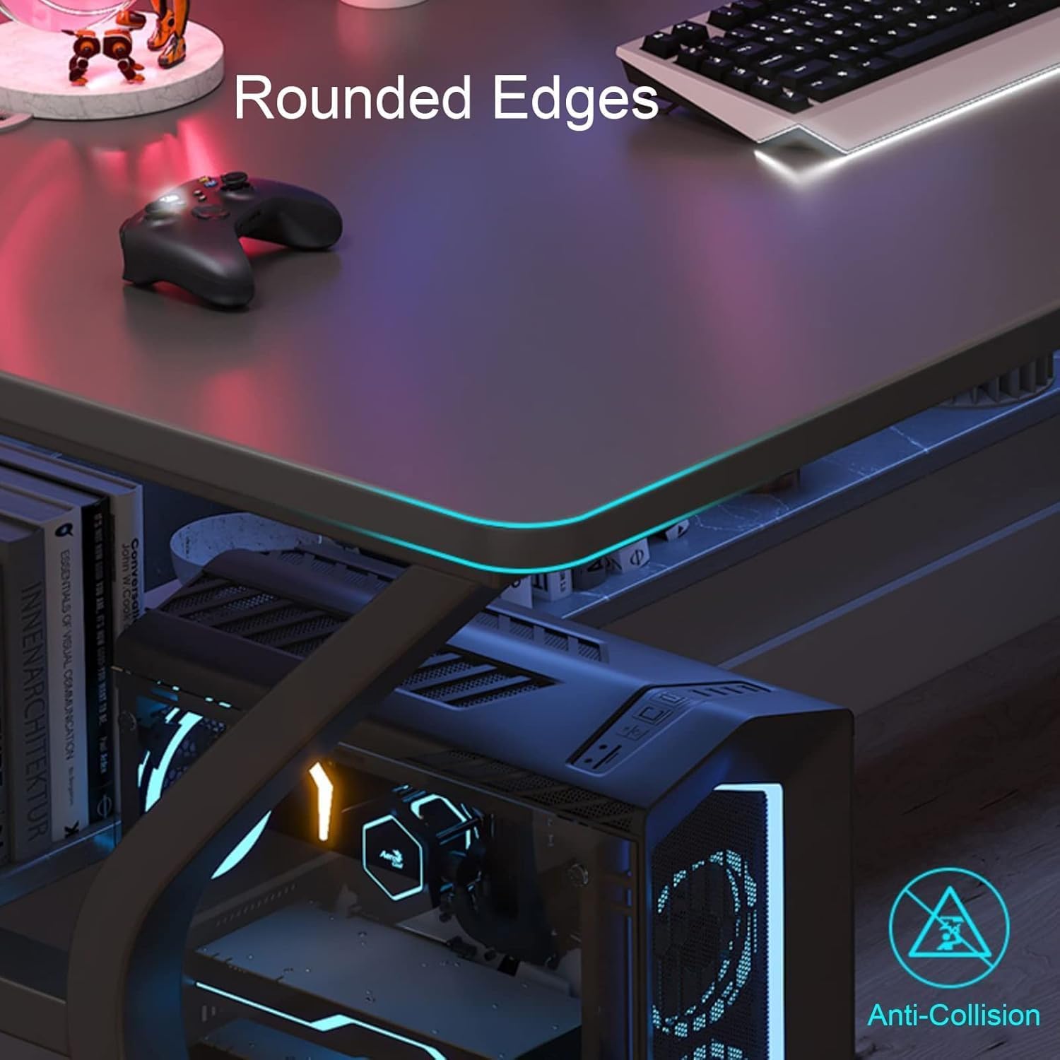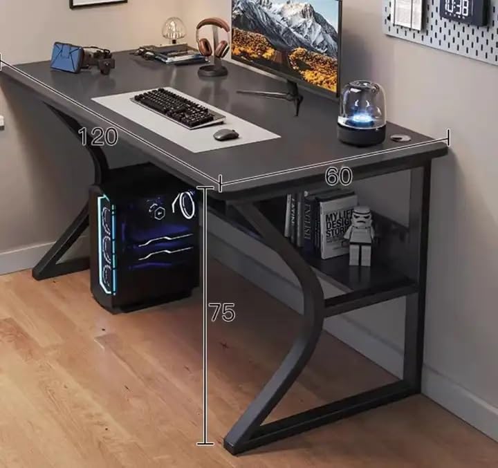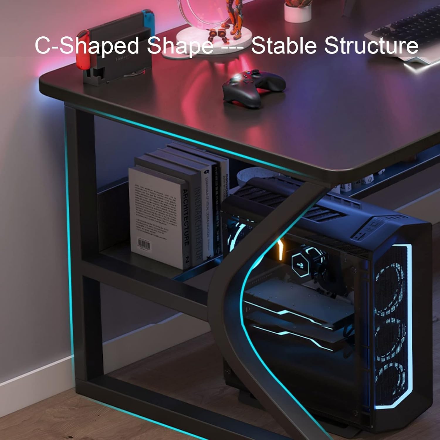 - Smart Integrated Storage Shelf: Spacious Lower Tier Holds Controllers, Headsets, Or Accessories—Maximise Space Efficiency In Small Rooms While Keeping Cables Organised and Hidden. C-Shaped Black Gaming Table 120x60x75cm