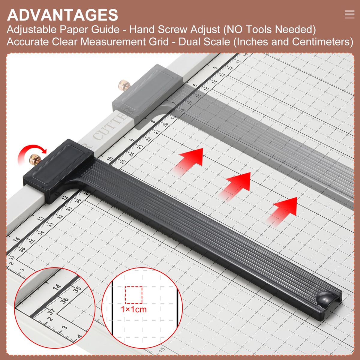 Product specifications dimensions: length 32 cm, width 27 cm, length of handle blade 47 cm. Attachment: Automatic Clamp, Adjustable Guide. Cut Length: 12" Cut Length, supports B7/B6/A5/B5/A4. Maximum number of cut sheets: 12 copies of paper. Cutable materials: perfect for cardstock, cardboard, vinyl, crafts, and photos.