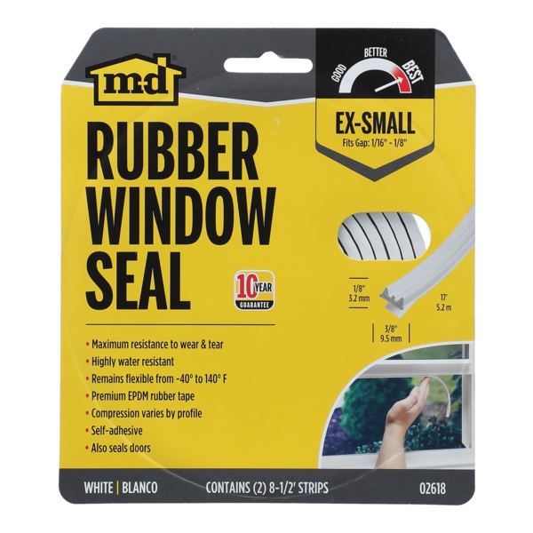 Seal gaps around doors and windows with the M-D Building Products Rubber Window Seal for Extra Small Gaps White 3/8inch x 17ft. It is crafted from EPDM rubber that effectively resists water, wear, and tear. This strip remains flexible in extremely hot and cold temperatures. You can also use it to efficiently block dust and drafts.