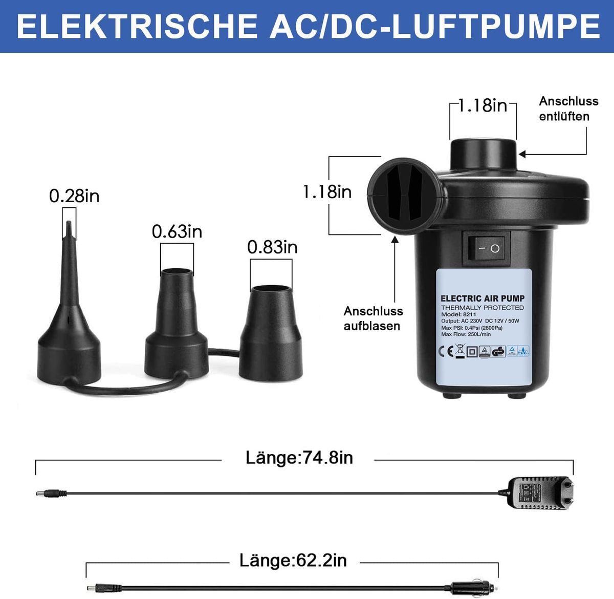 Electric Air Pump, Electric Pump 2 in 1 Inflate & Deflate with 3 Different Air Nozzles suitable for: